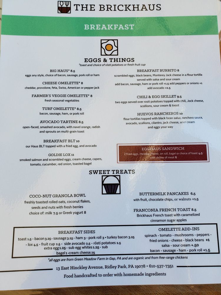 The BrickHaus in Ridley Park, PA is a trendy breakfast and brunch spot that caters to a diverse range of diners. With a menu filled with specialty sandwiches like the Alex's All American Cheeseburger and Dakota's Crispy Chicken, as well as salads, starters, and omelettes, there is something for everyone to enjoy. Customer reviews praise the delicious food, cozy atmosphere, and outstanding service provided by the staff, including standout dishes like the lump crab omelet and the Dakota fried chicken. The welcoming ambiance and attentive servers add to the overall dining experience, making The BrickHaus a must-visit destination. Whether you're looking for a quick bite or a leisurely meal, this cafe offers a wide selection of options suitable for various preferences and dietary needs.